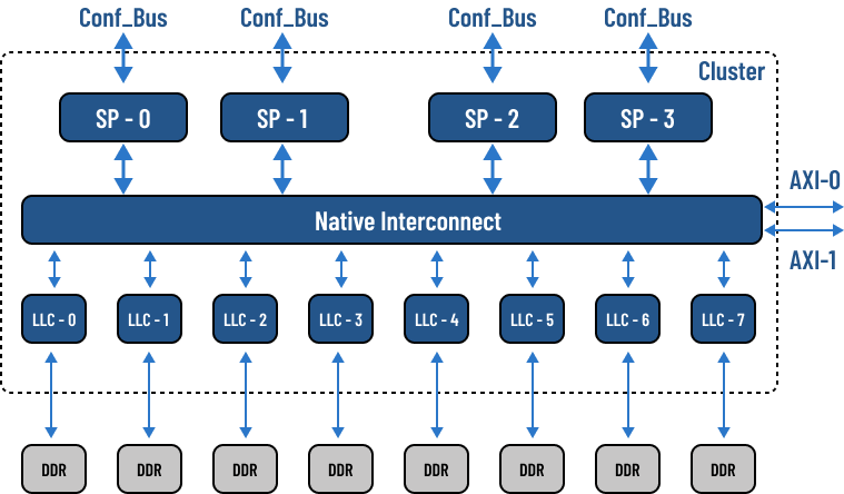 Cluster is top level integrated module consisting four instances of Streaming processor, 8 Last level caches and a native interconnect.